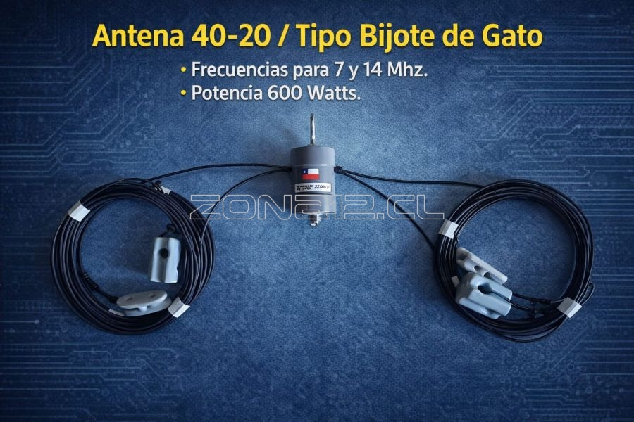 Antena tipo bigote de gato, banda de 40 y 20 mts., materiales de alta calidad y confección, centro de antena protegido, todo tiempo extremo, alta resistencia a UV y Salinidad, potencia 600 kw.